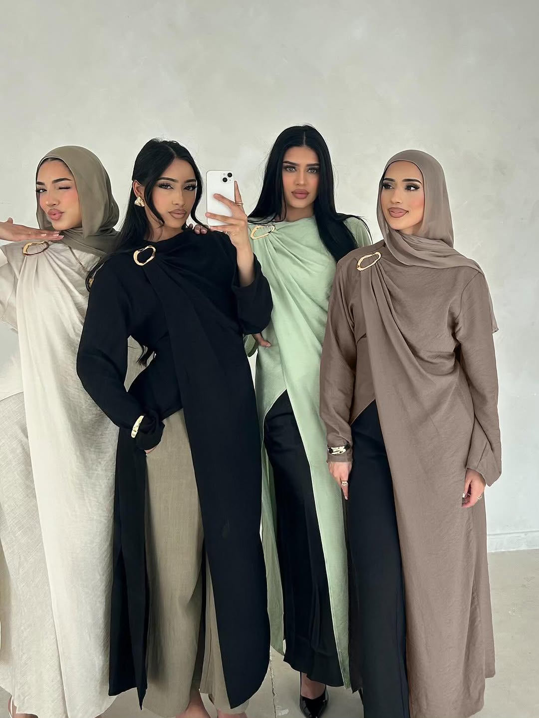 Este conjunto de tres piezas en tono marrón está diseñado para la mujer moderna que busca comodidad sin renunciar al estilo. Incluye un pantalón de corte ancho con cintura elástica, un top de canalé sin mangas de cuello alto y una chaqueta larga abierta que aporta fluidez y elegancia.